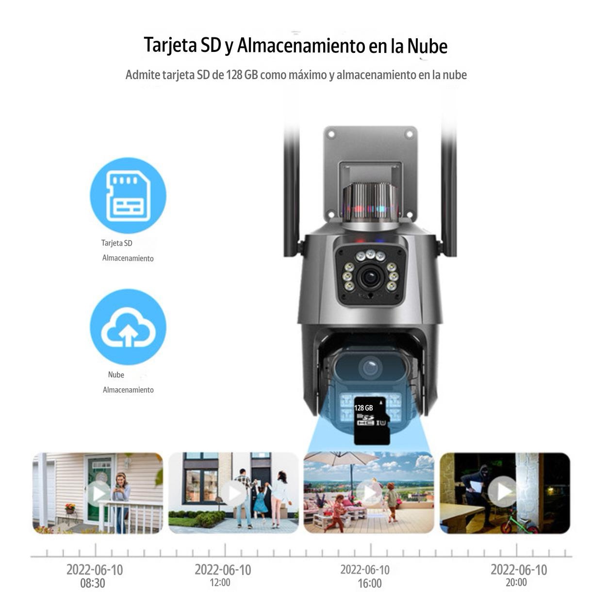 Compatible con tarjetas microSD (hasta 128GB) y opciones de almacenamiento en la nube (según configuración). Puedes revisar grabaciones en cualquier momento desde la app.